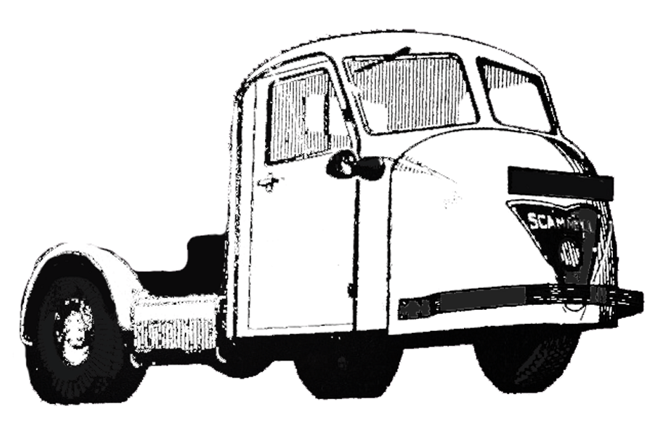 The Scammell Townsman three wheeler replaced the 3-ton Scarab in the Railway industry. It closely followed the Scarab in its basic design at the front. The futuristic lines of the fibreglass cab hid a great many new developments, such as vacuum-assisted hydraulic brakes. Fitted equipment included a heater-demister, two rear view mirrors, interior sun-visors, totally enclosed oil-immersed coil spring front suspension and dual rate mounting of semi-elliptic leaf springs at the rear. An unusual feature of the day was provision on the steering column for a Waso lock. The frame was of a welded construction and had integral coupling ramps fitted with Scammell Mechanical Horse automatic coupling. A vacuum operated release mechanism replaced the hand lever in the Scarab. The engine, gearbox and driving axle formed a rigid assembly pivoted at the front end in a large rubber bush. Later a larger engine was supplied and fitted; the Leyland OE160, but even with its better driver controls and faster road speed (50mph) the main customer was still British Rail. A few however did find employment with other operators including The Royal Mail. Production ended in 1968.