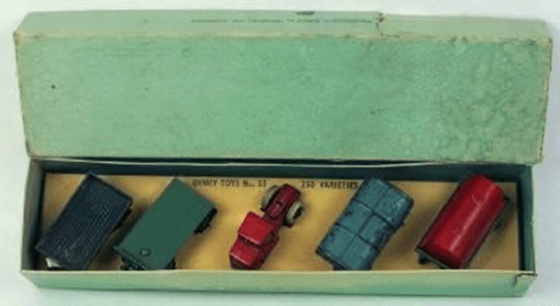 The Petrol Tank Trailer (33f) was a tinplate tank supplied with a Flatbed Trailer (33b) and was available in four liveries: Red Tank with Green Trailer, Green Tank with red Trailer, Red Tank with ‘Esso’ decal with Green Trailer and Green Tank with ‘Wakefield Castrol Motor Oil’ decal with Red Trailer.